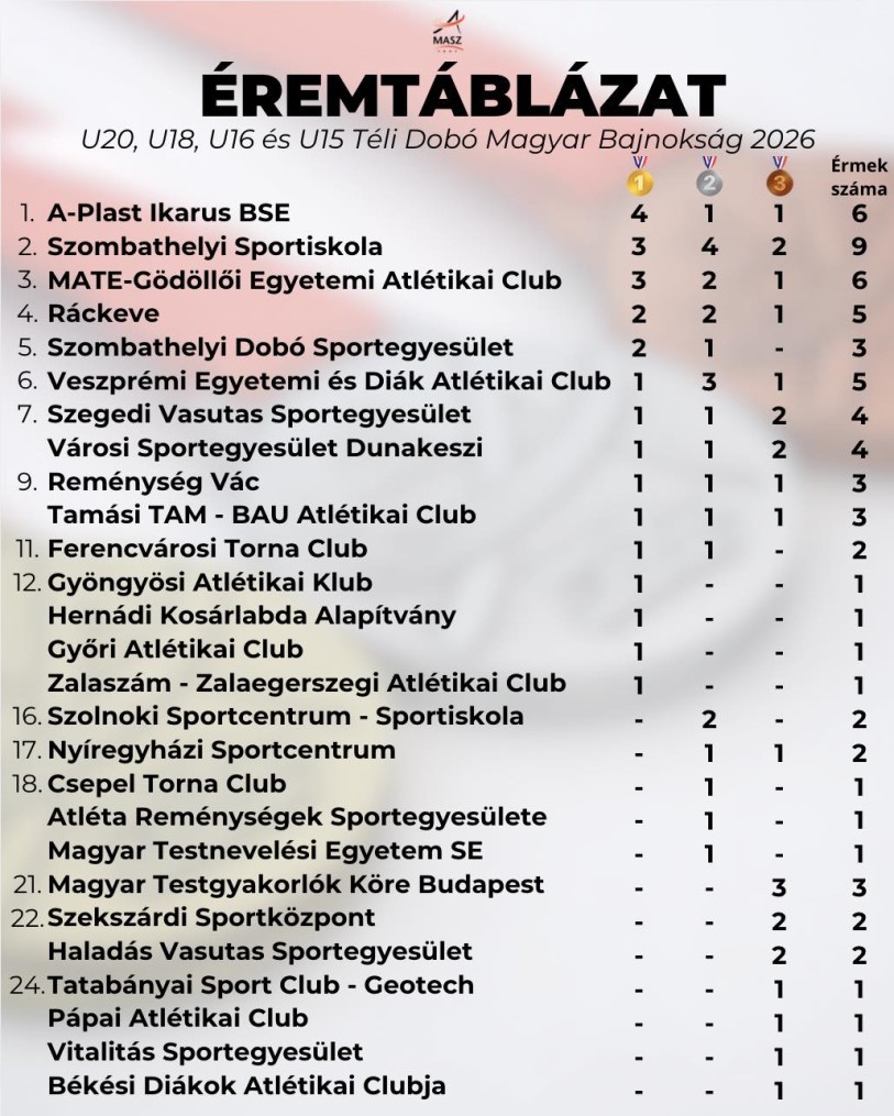 A korosztályos téli dobó országos bajnokságon a két duplázónak köszönhetően az A-Plast Ikarus BSE végzett az éremtáblázat élén a kilenc medáliát összegyűjtő Szombathelyi SI, valamint a MATE-GEAC előtt.